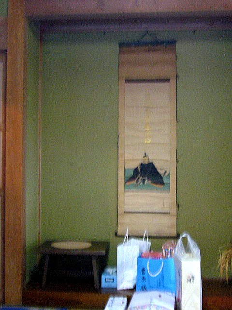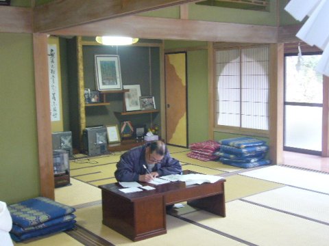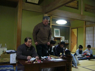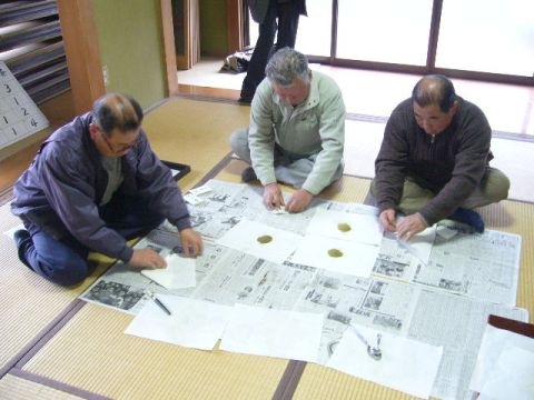 準備開始。持ち出されたのは煎茶、甘茶、ミカンの皮。これを焙烙でカラカラにして石臼で挽いて粉にする。できあがったものは和紙に取り、これから配合にかかる。スプーンである茶は煎茶3杯、甘茶2杯、ミカンの皮1杯、というように取り、4種類のお茶を作る。できあがるとそれぞれを3つに分ける。都合12に分け、これを一つ一つ畳んで包みにする。 一方では行灯作りだ。木枠に張った和紙に文字を書き今年用の行灯を作る。 3時、準備は一段落し解散。