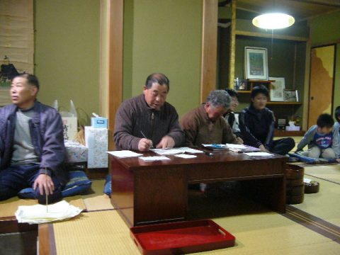 まず、子供たちが行灯を持って神社まで行く。神社から1個ずつ行灯を道端に置いてくる。神を迎える道案内である。部屋の周囲にずらっと座布団を並べ、参加者たちが座る。この日は村の者立ちだけという決まりだが、特別に参加することを許された。最近は集落の者だけでは少ないのだそうだ。各人の前には、和紙が一枚おかれる。そこには場の名前と「一、二、三」の文字が2つずつと客という文字が書いてある。予想を言った後、その部分を折って確認するのである。