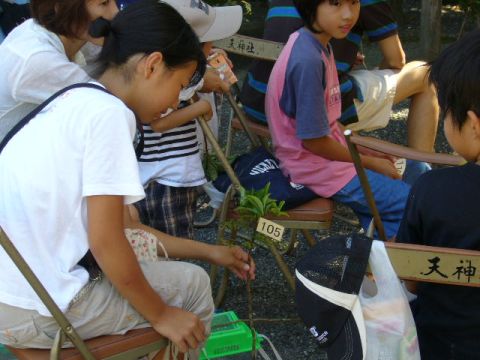 加治木町の蜘蛛合戦は300人以上も集まったが、こちらは50人程度、それも多くが子供で、付き添いだけの親が多いから出場する蜘蛛は、30匹程度である。 開始時間が近づき、神主のような格好をした行司が現れる。後から聞けば神社とはなにも関係の無い方だとか。