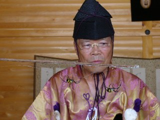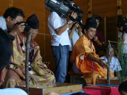 朝8時半に宿を出て神社に向かう。大きなビルはあるが寂しい感じだった町は中心に近づくにしたがって頼もしい町並みになっていった。会場となる一條神社は町の中心部。朝9時の競技開始というので、事前準備から見ようと行ってみると、そこには高い石段が待ち受けていた。登ってみると山頂に確かに神社。その境内の一角にテントが建てられ準備の真っ最中。建物の一つの前に椅子が並べられ観客席になっている。石段を上がったところに受付が設けられ、準備完了。