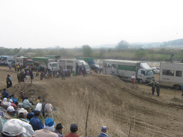 馬に重い荷が乗ったソリを曳かせて競走する遊戯は主に北海道と東北地方で行われている。 北海道ではばんえい競馬、またはばん馬と呼ばれ、東北では曳き馬や馬力と呼ばれている。馬券を発行して通年で開催しているのは、現在では北海道の十勝だけとなり、その他は年に一日だけの祭事である。北海道、東北ともに10ヶ所ぐらい行われているが、その一つの東北馬力大会が青森県の六戸町で行われた。六戸町は東北本線の三沢駅からバスで約20分ほど。広い町なので停留所を一つ間違えると大変である。奥入瀬川むつみ河川公園というところだというので、川を目指して歩く。 橋の上から見ると、遠くの方で人が集まっているのが見えた。たぶんあそこだろうと歩いてみると、はたして馬力大会は行われていた。場所は常設ではなく、この日だけ河川敷に特設会場が作られる。長さ200m、途中に3mほどの高さの山を設けた砂地のコースである。河川敷には馬を運べる特殊なトラックが何台も停まっていた。