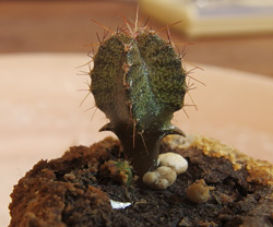 生育はゆっくりですが、草丈が3p程になり柱サボテンらしくなってきました。 |