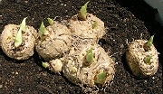 サカタのタネの「園芸通信」2006年3月号に、カラーの簡単な栽培方法が掲載されていました。それによるとカラーの根は、球根の下側から手はなく、上側の芽の付根から発生するとのことです。 余り浅植えにすると根の生育が悪くなるので、急遽、土を足して、球根上部から3cm程度の覆土になるようにしました。 |