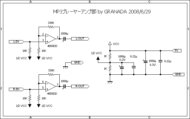 なお、1/2 Vcc 〜 GND 間の電解コンは必須。それなりの容量のものを付けてやらないと派手にノイズが乗るので要注意