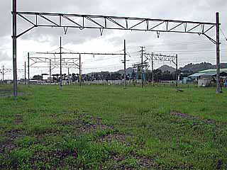 上白石駅構内を望む。 架線・レールは撤去されているが、架線柱の配列からその壮大な規模が伺える。 ちなみに、駅は、大荷主であった住友セメント栃木工場と隣接している。 奥が葛生駅方。 |