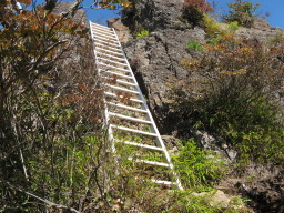 | 山頂から鍵掛峠に向かう崖道 この方面登山道に草おおくて、 道も狭く見にくい。注意必要。 |