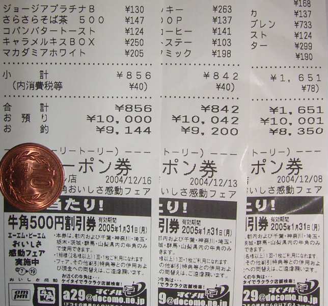 牛角(の経営母体)に買われた am/pm がレシートで籤をやっていて,当たれば牛角の500円割引券が附いてくる。シカシこれには重大な疑惑があるのだ。これを見ろーっ[写真; 69KB]。万札で支払いさえすれば,釣り銭高がどうあれ当たってしまうのである。さあ諸君も追試してみたまい。こんなことがまかり通っては正義はどうなる。牛角の経営はっ。