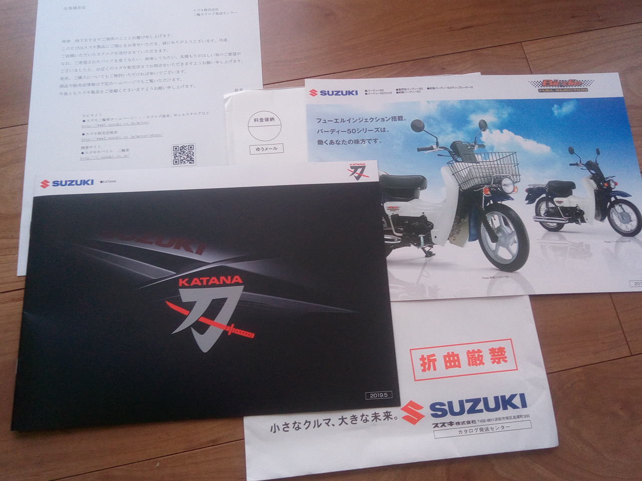 カタログ請求して新カタナのパンフレットを送ってもらったよ。どうもありがとうなのだ。ついでにバーディー50(生産終了)のも戴いたんだが,購入の可能性からすればアドレス110にしとけばよかったナ。