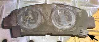 | 矢印部分のバネが付いている場所を忘れないように これは純正の内側のパッドです。白っぽい丸はキャリパーのピストンの 跡で、銀色のシムに付いています。この裏側には黒くてスリットの入った シムも付いています。 矢印の場所には、小さなバネが付いています。 パッドが減ったとき、ローターにこすれてキーキーなる物だと思います。 |