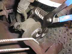| キャリパーは落ちないように吊しておく ネジを2本外すと、キャリパーは下に落ちてしまいます。 キャリパーにはブレーキラインが繋がっているので、これにストレスを 与えないように何かで吊しておきます。 できれば、丈夫なフックでサスのバネに引っかけておくと良いですね。 今回は何も無かったので、ロープで吊しましたが面倒です。 交換は、パッドについたバネを外し、パッドを斜めに傾けるようにすると 簡単に外れます。パッドの裏には鉄板(シム)が2枚付いているので 付き方を忘れずに覚えておきます。 |