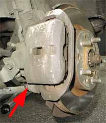 | リア・キャリパーの外観 リアのキャリパは、矢印の部分にある、12mmのボルト1本だけで止まっています。 キャリパを上に跳ね上げるだけでブレーキを見ることができるのですが・・・ |
