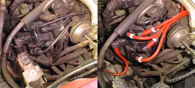 取り付けは、純正コードを1本ずつ外し、ウルトラと交換してゆきます。確かに、この方が誤りもありません。NAはインテークパイプがプラグの周りを通っているので、コードの取り替えは少しめんどうです。1番のコードなどは、4本全てのインテークの下をくぐらせてから取り付けることになります。エンジンルームを掃除した後ならいいのですが、汚れたままだと、折角の赤いコードも汚れてしまいます。汚れるだけならいいのですが、デスビキャップに取り付ける端子がむき出し状態ですので、このままでパイプの下をくぐらせると端子が汚れて接触不良を起こしそうです。そこで、コードの番数が書かれているタグの入ったビニールの小袋を端子に被せてパイプの下をくぐらせました。これなら、端子は汚れません。
