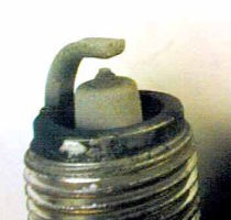 ちょっと写真では分かりにくいのですが、純正プラグの電極の碍子部分と、接地電極(アーム)の部分は、白っぽい肌色で粉を噴いたように焼けています。金属のネジの部分はカーボンがこびりついている状態です。この状態だと、ちょっと焼け気味ながら正常な部類だそうです。右の写真はイリジウム・プラグで、電極が激細なのが良く分かります。接地電極の先の方も削ってあり、中に溝が掘ってあります。ちなみに、電極のギャップの長さは、純正が1mm、イリジウムが0.7mmでした、純正も本来は0.7mmほどなので、電極がヘタってギャップが広がったということなのでしょう。