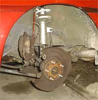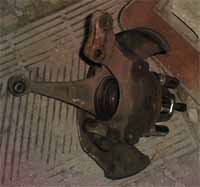 | ナックルを外して、ベアリングの様子を調べてみることにした。ドライブシャフトのナットを外した時の様子が左の写真。ハブのスプラインに比べ、ドライブシャフトが少しひっこんでいる感じ。この分ハブが手前に浮いてしまったのだろうか? ナックルを外してみたが、ベアリングに軸方向のガタは無かった。ずれた状態で固定(固着)されているのか、ベアリングのボールかカラーのガイド部がすり減っているか、どちらかなのかもしれない。ただ、ベアリングを裏から見た感じでは、軸方向にずれた形跡が無いので、すり減ったか割れた可能性が大きそうに思える。ナックルを外す様子は上で紹介している。 |