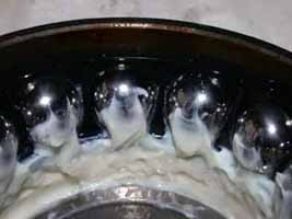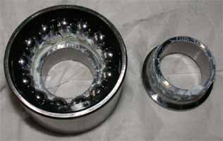 | ハブベアリングって、インナーカラーが真ん中で分離するようになっていて、なんと、外れてしまいます(^^;) ちなみに、インナーはハブのシャフト部分に圧入し、アウターはキャリア(ナックル)に圧入して使います。写真で見て分かるように、インナーの外側は広がっておりボールが外に飛びだなさいようになっています。また、アウターの真ん中あたりに段があり、ボールが奥にひっこまないようになっています。インナーとアウターに挟まれてボールは回ります。 | ボールは等間隔にならんでいますが、これをガイドしているのは、黒いプラスチック製と思われる部品です。これで、ベアリングがこの位置から動かないように固定しています。このおかげで、インナーを外してもボールはバラバラになることはありません。中にはたっぷりとシリコン・ラバーグリスが詰まっています。 | 図にすると、こんな構造です。黄色いのがボール、灰色がカラー、青いのがハブ(アクスルシャフト)です。この図では上下方向はボールにしっかり押さえられ強度がありますが、横方向はカラーの段差や飛び出した部分だけで押さえる構造です。 |