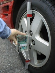 測定の方法は、ホイールのリム部分にアルミパイプを当てて、アルミの上下の傾きを計測します。リムが曲がっていると正確に計れませんので注意しましょう。ちょっと怪しいかなと思った場合は、車を数10cm程度動かして計ってみます。本来のキャンバーはホイルのリム部分ではなく、ハブ(ホイルの取り付け部分)で計るのが正しいのでは無いかと思います。修理朱書などでも、そのような測定器が紹介されています。