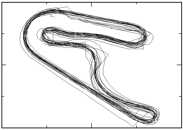 だめじゃ、こりゃ(笑) データは、2002.10.12のTC2000での30分間の走行軌跡です。 コース幅一杯にいろんなラインで走ったように見える軌跡ですが、そうじゃなくって、誤差で軌跡が広がっています(^^;) S字の処を見るとよく分かります。直線的に走っているのでS字にはなってませんが、幅は広いです。±5mくらいの誤差はありそうですね。時々大きくコケるのか、コース外も走っています(笑)