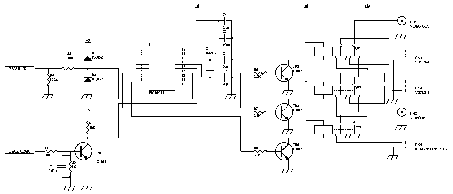 ハードもソフトも結構簡単です。機能的には、2台のCCDカメラとカーナビを切り替えるようになっています。CCDカメラに接続した時だけにカメラへ電源が供給できるようになっています。あと、時速30km/hになるとレーダー探知機がONになる回路も含まれていますが、この回路自体で速度計測するわけではなく、この先の操作部から信号を出していますので、ただのスイッチになっています。RS232Cの入力は、いきなりPICの入力を使っています。一応保護用にダイオードを使っています。RS232Cのボーレートは9600bpsで、操作部はナビトラモニタを使っています。