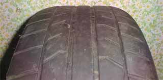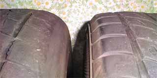 RS tuneの様子です。 上の写真は、右がアウト側、左がイン側です。フロント同様にエッジが完全に無くなっていますが、フロントとは逆に内減りしています。内側は、ほぼスリップが見えていますが、外側はまだ4mm程度ミゾが残っています。一番減っているのは真ん中です。ブロックが一部欠けている処がありますが、真ん中より内側は、ブロックの真ん中が大きくえぐれている感じで、外側はミゾの周辺が少し欠けているといった感じです。偏摩耗はありますが、フロントほど奇妙な減り方はしていません。 下の写真は、同じ左リアタイヤの内側(右)、外側(左)を並べたものです。エッジが摩耗しているのが良くわかります。摩耗具合は2段減りしていて、大きく削れていたのは純正足の頃、バネを強化してからは軽減しているようです。 外より、内側の減りが多いということは、結構キャンパが付いてしまっているのかな? デフォルト6mmのトーインで、4mmくらいに設定してあるつもりなので、少なくてもトーアウトにはなっていないように思えます。エッジは無くなっているので過度に横Gを掛けたことは確かですが、内減りが多いのは、通常走行時でも結構削れているせいかもしれません。また、半年ほど(数回分)ジムカでは、ドリ用タイヤで走行したせいもあり、意外に減りが少ないのかもしれません。 トータルで見ると、フロントの外が減っているのは、ターンインでタイヤに頼った運転をしていること、アンダーを多く出していること、今のアライメントではリアの内減りが有ること、リアは街乗りでも結構減ること、といった処でしょうか? |