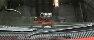| ダッシュボードの上に、専用の台を使って貼り付けます。結構良さそうな台ですが、実は似たようなカーナビモニタ用の台が車に乗っています。最近の流行でしょうか? カーナビの台は今は使っていませんが結構良かったです。何処に取り付けるか決めてなかったので、今回はビニルテープで貼り付けただけで仮設してみました。電源は、シガライタから取るケーブルが付属しています。仮設ということで、電源もシガライタから取りました。設置のポイントは、装置から前の車がちゃんとみられる場所に置くことです。どんな距離でも安定させて動かすには、赤外線の光が水平になるようにしなくてはなりません。古めのトヨタ車はダッシュボードが高い位置にあるので問題ありませんが、ホンダ車なんかは、装置は結構高い所に持ち上げないとダメでしょう。車の前でしゃがみ込んで、ちゃんと装置が見えるか確認しましょう・・・ | ![]() |