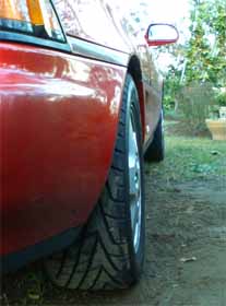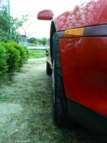 | 購入後1ヶ月半、やっと装着した。リアは加工が必要なのでフロントに装着(上記写真)、はみ出すかな?と思った物の、まだまだ大丈夫(^^;) ただ、フェンダの内張りやツメには当たるかも? スペーサはトルクレンチで10Kgで締める、ちゃんと付ければ、簡単にセンターも出るので問題無いだろう。ただし、スペーサに純正ホイールを取り付けるのはセンター出しに苦労する。 4ヶ月遅れでリア用も購入、前後装着してみた。山の中をちょこっと走った感じでは、コーナリング特性がかなり上がった感じ、値段の割には効果が有るパーツのように思える。リアを僅かに広めにしたせいか、コーナー中の安定性は良くなった。アンダーになったとまでは感じないから良いバランスかもしれない。 ただし、轍に敏感に反応するようになった、慣れないと運転しにくい。100km/hを越えると僅かにハンドにに振動を感じられる、140km/h程度でも、さほど増えないので、この程度なら問題は無さそう・・・ あとは、ホイールの取り付けはかなり面倒になった。センター出しは苦労させられる。 |