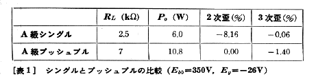 特性曲線を使って、パソコンに歪みを計算させるプログラムを以前から使っているのですが、これを使って歪みの成分を分析してみると、興味深い結果が得られました。最大出力時の全高調波歪み率は、もちろんシングルの方が断然多いのですが、表1に示すようにその成分はほとんどが2次歪みであり、今回の条件では3次歪みはごく僅かです。これに対しプッシュプルでは、波形の合成により2次歪みは計算上0になりますが、3次歪みはシングルに比べて増加しているのです。この動作例はA級プッシュプルですが、AB級やB級プッシュプルでなくとも、やはり3次歪みの増加がみられることがわかりました。