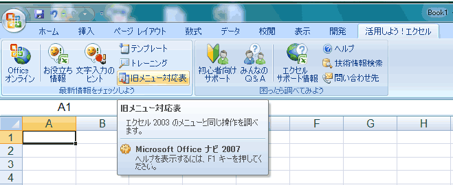 A.今までのメニューに当たるところの右端に、「活用しよう!エクセル」という