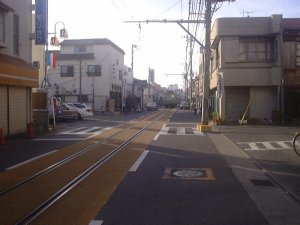 左側に車が止まっていますが、車すれすれ を走ります。当然徐行ですが、人が走るより 早く、自転車より遅いです。 東京の早稲田や、鹿児島や長崎の路面電車 は1両ですが、4両は長いのでしょう。 |