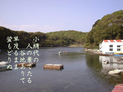 「小網代湾の奥」 右の歌は 横浜の井上洋氏の 1997年日経歌壇、高野公彦氏 の撰の歌です。 僕は ここでまだ 蛍を見ていませ んが、静かな入り江で とっても この歌がぴったりで 歌も場所も 気に入っています。 この手前の反対側の湾が 油壺湾 です。観光客が割と通る油壺・諸磯 の湾に比べて 小網代湾は寂しい くらい静かです。 |