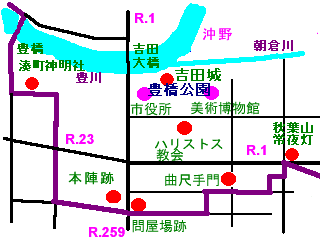 JR豊橋駅下車 豊橋鉄道市内線(市電) ★豊橋公園/豊橋ハリストス正教会 市役所下車北へ徒歩3分 ★吉田宿本陣跡 札木下車西へ徒歩1分 ★曲尺手門跡 豊橋公園前下車南へ徒歩1分 ★豊橋・くらしのなかの史跡 ★豊橋ハリストス正教会とイコン ★吉田城と造形パラダイス ★ふらっと旧東海道 ★吉田宿 ★とよがわ散歩道 ★とよがわ/お城下 ★沖野の春 |