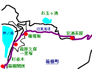 ![]() ★今回のルート 小田原宿〜箱根宿 約16kmを5時間30分で。 平成13年11月23日取材 紫色のルートは歩いたところ 畑宿歩道橋から甘酒茶屋,白水坂, 権現坂,葭原久保一里塚を経て 箱根関所まで (この区間約3km 徒歩1時間20分) 一番上2枚は, 平成14年3月31日撮影 |