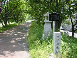| 田沼街道蹟 説明板には,「勝草橋の西袂から瀬戸川堤を, 110m位南下した, ここ志太四丁目1,454番の9地先が, 東海道と田沼街道の合流点である。」とある。 相良藩主田沼意次にゆかりのある地である。 |