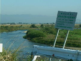 | 豊川は, 豊橋市下条西町および豊川市行明町付近で 大きく左に(南に)曲がります。 手前が行明町(豊川右岸), 対岸が下条西町(左岸)です。 |