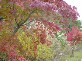 | 茶臼山高原道路の紅葉。 | モミジの向こうの黄葉は,萩の葉。 |