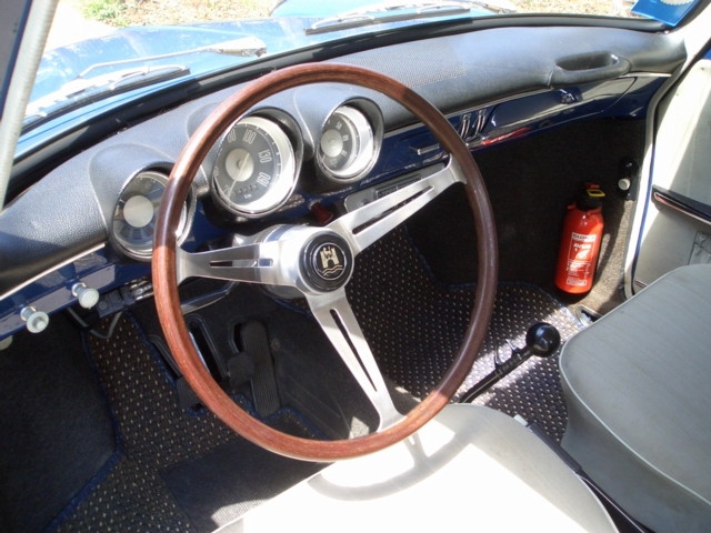 | all original body paint - L663 VW blue, installed Porsche 914 Pedrini wheel, German NOS over rider, and door finger plates. |