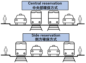 路面電車は道路の中央に走ることが一般的ですが、歩道側、すなわち道路の両端に分かれて運転する場合があり,この構造を通常の「中央リザベーション方式」に対し、サイドリザベーション(side reservation)方式と言っております。