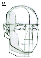 正面顔は単純な図形を利用して描いた方が綺麗に描けるよ。「頭部」のコーナーの最初のページを参考にして、そこに十字を当てはめて頬や細かい部分を描き込んでいこう。