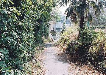 下の写真は所沢市山口の山口小学校西側にある道です。この丘陵を南に下る坂道は鎌倉街道跡と伝えられています。小道ながら舗装された道幅は約2メートルほどです。両脇は鋭く削られたV字形の切り通しになっています。南北に50メートルほどのこの切り通しの小道は、所沢市内に残る顕著な鎌倉街道の跡といわれます。知らない人が通れば、ただの小道の坂にしか感じられないのではないでしょうか。テレビ埼玉で放送された「鎌倉街道夢紀行」で、旅人の村松建さんが、ここを味わい深げにゆっくり歩いていましたが、普通の人が普通に歩いたら、ものの数十秒で通り過ぎてしまうような、そんな坂道です。