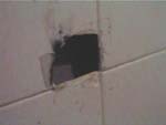 壁に穴があいているものがありますが、それは女子用に続く壁です。ただし、貫通はしていませんでした。 大便器の周囲は水でぴちゃぴちゃしており、照明が暗いのとあわさってあまり長居したくない雰囲気を醸し出しています。- 落書き1(女→男)