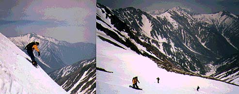 1997-5-11 針ノ木岳をボードで滑ってきました。2年前に天気が悪くて中止して いたので、雪辱戦。 ボードにはとても向いていると思います。 7:00 扇沢 出発 7:50 大沢小屋 着 8:00 雪渓に取り付き ところどころきれて、豊富な水音が聞こえる。デブリも多い。 10:00 マヤクボ沢への分岐 アイゼンをつける。 11:00 2600m付近の台地に出る ここから山頂へ直登すると、最後が壁のように急なので、マヤクボ のコルから 夏道をいく。岩場なので、板を背負い、プラスチックブ ーツだととても大変。 12:00 山頂(2820m) 剣と立山が真正面に見えて楽しい。 13:00 滑降開始。山頂直下は壁状なので、針ノ木峠方面へすこしトラバース。 1段大きく下がるので、ほかのスキーヤーはバックステップで降りていた。 ボードは横滑りで解決。 斜面は広くどこも快適。全体に急で部分的に30度強あるところも。 雪渓まで降りると、デブリをさけるため、ボードには辛い長いトラバース。 14:00 大沢小屋の手前で、切れ切れですべりづらくなったのでおしまい。 感想 登り返しがほとんどない上に、ルートもわかりやすいしブッシュもない。扇沢から もすぐ取り付けて、日帰りもできる。ボードには最適だと思います。 ただ、マヤクボ沢はアイゼンがあった方がいいようなので、ソフトブーツでは厳 しいかも。 97-5・11 桃