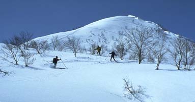 1993-3-21 メンバー 北田紘一、あいり、汽車 大草連からピストンするルートもある。段々畑のようなところを登って、森をぬけ、頂 上にいたる。いなかの裏山というかんじでそれはそれでわるくない。 今回は老舗山田旅館をベースに、熱湯からの最短コース。おっと湯峠からのんびりとい くルートもある。 900発、熱湯からいきなり急な尾根にとりつくしばらくのぼってようやく、広い台地にで る。大渚山の大斜面があらわれる。ひたすら登るだけだ。湯峠からのルートをあわせ、 頂上下のセッピ状の尾根をまわりこむとピーク。1130。 後ろには雨飾山、向いには北アルプス、展望はよい。のんびりしてから往路をくだる。3 00帰着。山田旅館で湯治して、明日は雨飾山だあ。