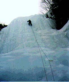 今冬は10年振りに冷え込んだ昨シ-ズンからそのまま氷河期へ移行するのかもしれない という一部の無知蒙昧なアイスクライマ-の稚拙な思い込みをちゃんと裏切って、見事な 暖冬でやんした。湯川も南沢も、こんな暖っけえシ-ズンでも東京から裕に日帰りで、そ れなりにバ-チカルな氷の練習ができるとってもありがたいエリアでごんす。 1997-2月9日(日)湯川(八ヶ岳の東側北寄り山麓海ノ口) 前日は甲斐大泉に泊まったので、らくちん。清里から野辺山、小川への分岐を超して30 分で湯川の入り口。国道から5kmほど湯川沿いの林道を走る。雪は多くないが凍ってい る。林道の周辺にすだれのように、氷柱が現れたら、車を路肩に止める。川を覗き込むと 、あるわあるわそこいらじゅうが氷壁。 準備して河原に降りると、さしずめアイスアリ-ナといった風で氷壁に囲まれるが、や さしい壁はほとんどない。「乱菊の氷柱」は、さすがに冷え込みがいまいちのせいか、 みるからに脆そうでトップロ-プでさえ躊躇してしまう。「白髪エリア」の南面は多分 もっとも迫力のある壁で、全体が緩やかにハングしており、しかもロ-プ一杯のスケ- ルがある。すでに陽が当たっていてぼたぼた解けはじめているのでパス。 小沢を挟んだ対面に北向きのつらら状が横に50mほど広がっている。スケ-ルは20 m前後。見た目もっとも安定している部分をはじめ僕がリ-ドし、そのまま残置したハ -ケンを使って、アイスクライミングを始めたばかりのヤッチン(安田至宏)がリ-ド した(5+)。 そのあとすぐ横のハングした部分をトップロ-プで繰り返し練習したが、ラインを変え て2度登っただけで、かなりキテしまった。便利さと難しさに、セカチャンもある。時 代はマルチ~。林道を挟んですぐ上に立っている岩がクラックの宝庫だ。暮れはさすが に凍っていなかったので、コ-クスクリュ-(三つ星ハンド、5.9)、サイコキネシ ス(フィンガ-、5.10+)を登ったっけ。諸君、フレンズ必携だぜ。 3月8日(土) 南沢(八ヶ岳阿弥陀岳西面のクラッシックな氷壁) この日を挟んで東京の気温は連日20度を超えていたので、さすがの私も不安だった。し かし、美濃戸からチンタラ1時間歩いて覗いてみたら、なんとバッチシ。しかも、例年よ りも発達していて、これなら質量とも大同心大滝と遜色なし。 手前にある20mの“初心者、中級者向き”とトポに書かれている滝は、それほど易しい とは思わない。もっとも寝た部分を選んでも悠に4+はあると思った。とまれ、この壁は 初めて両手を放してハ-ケンを打ちながらリ-ドする練習に適している。 ヤッチンが買ったばかりのナジャをぶん回して、僕のリサイクルなしで上手にリ-ドした (5-)。 大滝35mは僕がリ-ドする。何度も登っているが、こんなにきれいに発達 したのは初めてだと思う。通常は2段に分かれているのだが、この日は殆ど1枚壁で、全 体に立ってる部分が長い。 結局、道具のせいもあるが(パルサ-)、いままでで、一番良いスタイルで登れたと思 う。打ったハ-ケンは6本でそのうち完全に体重をかけて打ったのは核心部入り口の2 本と出口手前の1本だけだったから臆病者の僕としては、上出来、“自分を誉めたいと 思います”...カカカ。