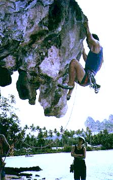 メンバー=HIKARI,MOMO,KEI,ITO東京からプーケットまで飛んで、タクシーを乗り継ぎアオナンへ。さらにボートでプラナン 岬へむかう。陸路がないため島でもないのに舟でいくしか方法はない。 ここにいたるまでも石灰岩の巨大な岩峰がニョキニョキそびえていて、南タイは岩場だらけ と言い合っていたのだが、ボートが岬に近づくにつれて、あたりの様子がみえてくる。サン ゴ色の砂浜、ヤシの林、断崖、その断崖がクライミングにぴったりの壁なのだ。 ハイシーズンとあってプラナンのバンガローは満杯状態。汗をかきかき、ようやく空バンガ ローをみつけて荷をとく。 クライミングショップで最新のトポを手にいれ、それからの4日、私たちは朝夕のクライミ ングと日中の海水浴を日課としてウダウダとすごしました。 プラナンは日本ではまだ知られていないほうですが、欧米人のあいだでは人気のエリアで、 とくにフラン人が積極的にルートをひらき、いま、250本以上の好ルートがあるとか、グ レードも幅広く、レベルにあわせてたのしめるしかけになっている。 前傾壁やルーフの岩も多く、今風のクライミングにぴったり。ぼくらにはどちらかというと 不向きな岩場ではあった。 ボルトもしっかりとペッツエルなどがうたれていて、スクールなどもあり。 タイ人のクライマーにパリジェンヌ風の娘がクライミングを教わっている風景もしばしばみ られた。 1月とはいえ、日中はバカ暑いので、朝と夕方にクライミングするのがよいでしょう。 食堂で食べるタイフードが美味で食べ歩いたり、離れ島にツアーしたり、クラビーの町に遊 びに行ったり、あんまりクライミングはしませんでした。 プラナンのバンガローが日本から予約できるといいのですが。電話がつうじるのでファック スで頼めるところもありそう。そのほかは問題なし。 エアチケット入手のさい、旅行社に予約を頼むのがよいかも。 トポはカラファテで売っているのをみたことがある。