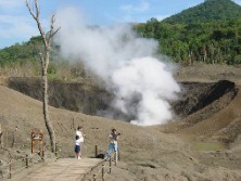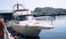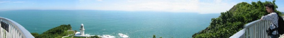 | 2日目 | ・朝目覚めると快晴・風も穏やか。「よしよし、これはホエールウォッチングできるな」と思うと、朝食バイキングを早々に摂り室蘭へ車を走らせる。室蘭ICで下り、白鳥大橋を渡り待合所に9時15分頃到着。受付を済まし、しばらく待つと船に案内され、ライフジャケットを着込み乗船。いよいよ今回のツアーのナンバー1プロジェクトです。室蘭港を出港し地球岬を眺めながら沖に出るも鯨はおろか、いるかにも出会わない。しばらく流していると他の船から無線が入って、今いるかに遭遇しているとのことでそちらに向かう。しばらくすると、カモメが群がっている海面にはいくつもの波しぶきがあがっており、複数の背びれが見え隠れしているのが見えてきました。おぉ、いましたいるか。群で餌を追っている模様。しばらく眺めていたが、船酔い人が増えたため引き返すことに。いるかは90%の高確率で遭遇できると聞いていたのでもっと派手に出会えることを期待していたので少し物足りない。しかしいい経験をさせてもらいました。そこから10分ほど車を走らせて地球岬へ。ここは予想外にいい。良かった。もう開放感満点。船上から見ることが出来たし、最初どうしようか迷っていたのですが、来て良かったです、ほんと。続いて目指したのは有珠山西口火口。途中の昭和新山も迫力ありました。小学校の教科書に載っていたの見て、子供心に迫力を感じたものでした。いまだ煙があがっているのにはビックリでした。西口火口の駐車場に車を止め、受付で名前を記入し遊歩道を上へ向かう。ここは噴火後も復旧せずにそのまま見学コースにしたところです。近辺の道路は今でも復旧されていません。車は水没しているし、家も火山灰で埋まってる。いまだに煙も噴いている。大迫力です。これぞ大自然の驚異。遊歩道を上がっていくと、うぅ〜。硫黄の匂いと旅の疲れのためか少々気持ち悪い。それでも一通り見学して、車のある駐車場に。車に乗り込み洞爺湖湖畔にあるいこいの家へ。今日初めての温泉です。あぁ、癒されます。洞爺湖を見ながらの入浴は、す〜と疲れが抜けていくのが実感できます。まだ4時であるがもう見所はないようなので今夜の宿泊地へチェックイン。少しくつろぐと早速宿の大浴場に足を運ぶ。露天もあるしサウナも完備、温泉を満喫しました。 |