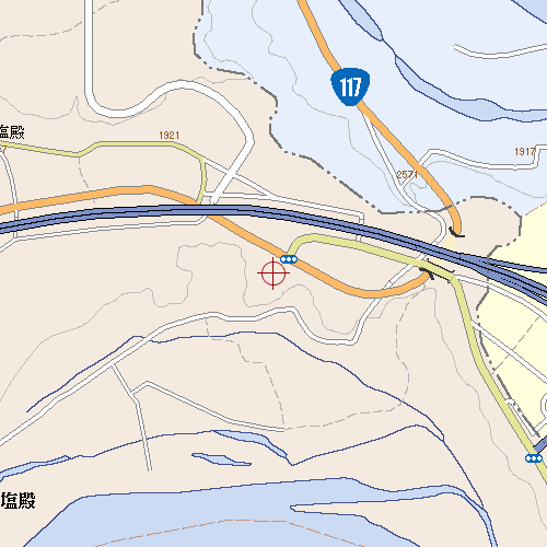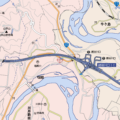 ヤマザキデイリー塩殿店は中心の十字です。 関越道 越後川口IC出口を右折して500mほど先でR117 にぶつかったところの三叉路にあります。 高速道と一般道が複雑に立体交差していますので、わからなくなったら当てずっぽうに走らず、地図を見てください。