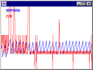 メモリ使用量と、1フレームを処理するのにかかった時間をグラフ化すると、 以下のようになります。青い線がメモリ使用量、赤い線が時間です。 (VMのメモリ使用量は、HotSpotVMでのデフォルトの最小4M、最大64Mです。 classicVMのデフォルト、最小1Mという設定では、HotSpotVMは起動すらしません)