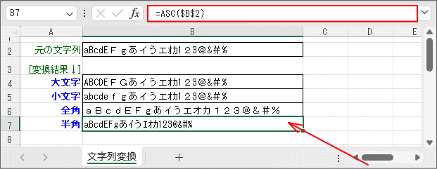 全角(2バイト)文字を半角(1バイト)文字に変更します。 引数は変換元の文字列です。 |