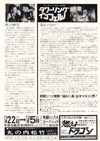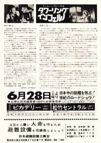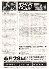 | 裏違いのパターンで日付だけが違うというパターンはよくあります、このタワーリングインフェルノも「燃えよドラゴン」の宣伝がありますがほぼそのパターンです。 ただこのチラシは日付だけ違うパターンではあるもののその日付で値段が全然変わってきます、左の6月28日のチラシは初版物で右はリバイバル公開のチラシだそうでこのチラシはそれだけで倍値段が違いました。 ametaroは全然知りませんでしたが水野書店のおばさんに教えてもらいました。 |