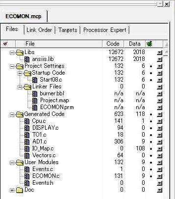 プロセッサーエキスパート(PE)で設定した結果、下図の様なソースファイルが生成されます。初期設定は全て完了していますのでMAIN関数の含まれているECOMON.cのみを記述します。