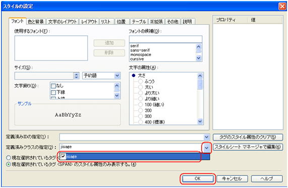 ⑩ 「スタイルの設定」ダイアログの[定義済みクラスの指定] 欄の [▼] をクリックし、先ほど設定したクラス名を選択します。